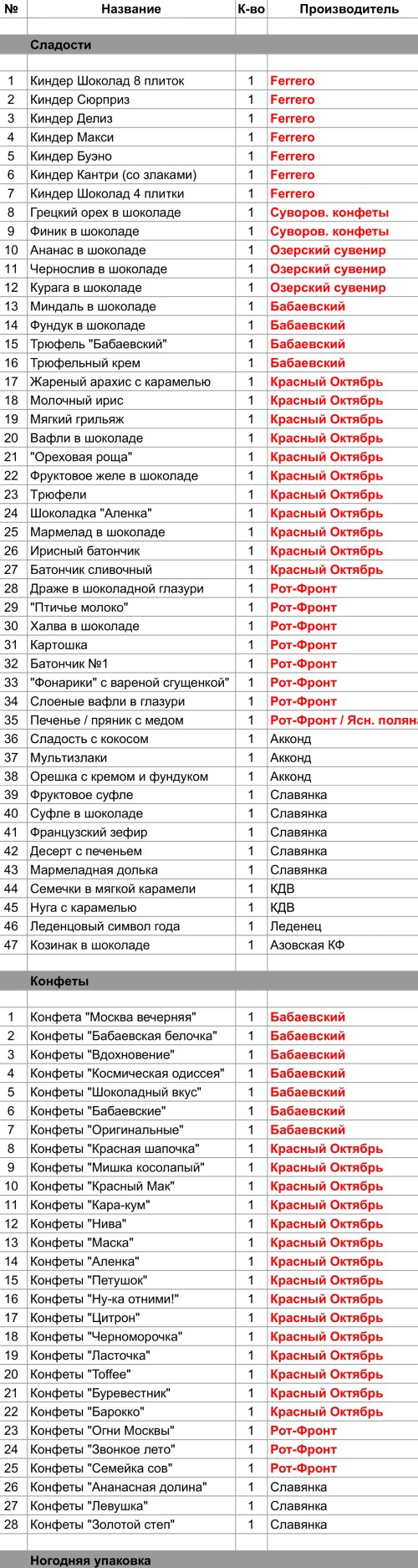 Конфеты "Огни Москвы" (1 шт), Конфеты "Звонкое лето" (1 шт), Драже в шоколадной глазури (1 шт), "Птичье молоко" (1 шт), Халва в шоколаде (1 шт), Картошка (1 шт), Батончик №1 (1 шт), "Фонарики" вареная сгущенка (1 шт), Слоеные вафли в глазури (1 шт), Печенье / пряник с медом (1 шт)